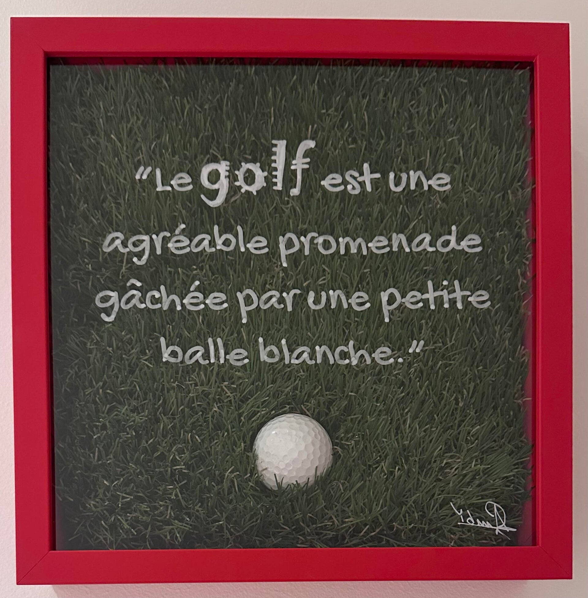 Peinture acrylique, balle de golf et gazon green artificiel.
